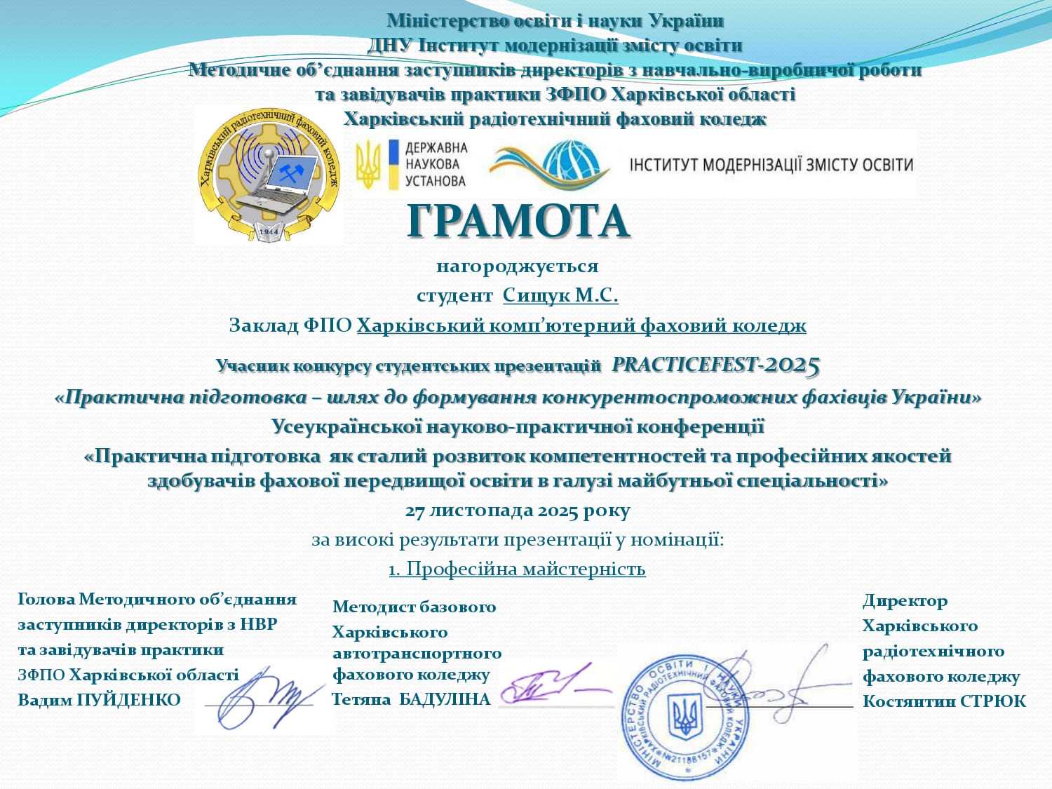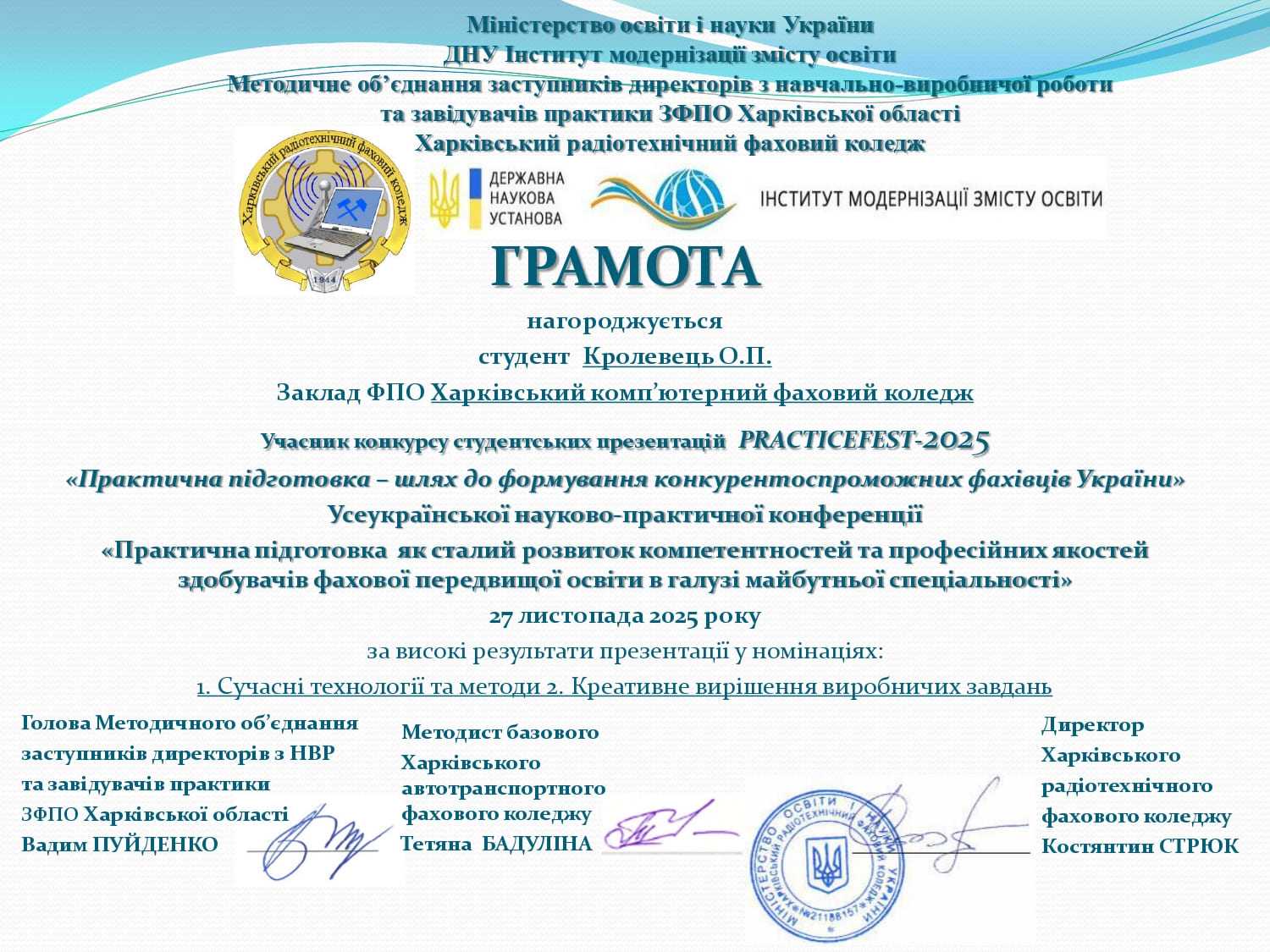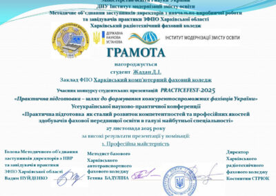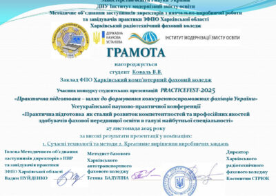 27 листопада 2025 року спільно з ДНУ «Інститут модернізації змісту освіти» в рамках Всеукраїнської науково-практичної конференції «Практична підготовка як сталий розвиток компетентностей та професійних якостей здобувачів фахової передвищої освіти в галузі майбутньої спеціальності» відбувся конкурс студентських презентацій «PRACTICEFEST – 2025: «Практична підготовка – шлях до формування конкурентоспроможних фахівців України». Приймали участь студенти групи П-22 Владислав Коваль, Олег Кролевець, Микита Сищук, Дмитро Жадан.