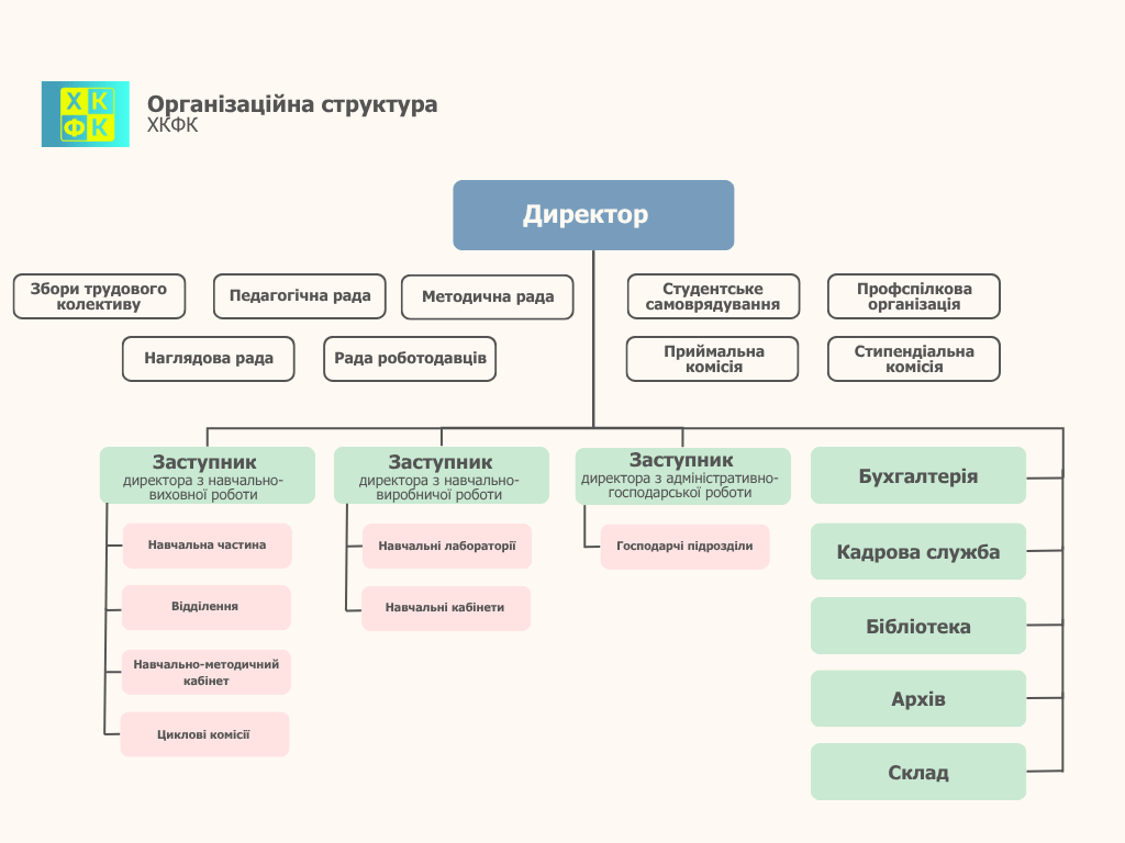 Харківський комп’ютерний фаховий коледж є державний закладом фахової передвищої освіти, що підпорядкований Міністерству освіти і науки України. Система управління коледжу відповідає ст. 24 Закону України «Про освіту» № 2145-VIII від 05.09.2017, Закону України «Про фахову передвищу освіту» та Статуту закладу. Управління здійснюється в межах повноважень, визначених законами та установчими документами закладу освіти.